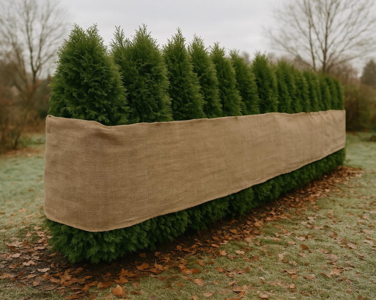 Ett smart alternativ är att använda skyddsskärmar i juteväv monterade på pålar istället för att linda in växten helt. Den här metoden skapar en skyddande barriär mot frost och vind, samtidigt som den låter luften röra sig fritt runt grenarna. För häckar som är särskilt utsatta för tung snö, som högväxande och smala sorter som Smaragd, kan det dock vara nödvändigt med ett mer omfattande skydd. I sådana fall kan du använda juteväv för att linda in hela häcken, men se till att lämna ett litet luftgap mellan materialet och barren för att undvika skador.