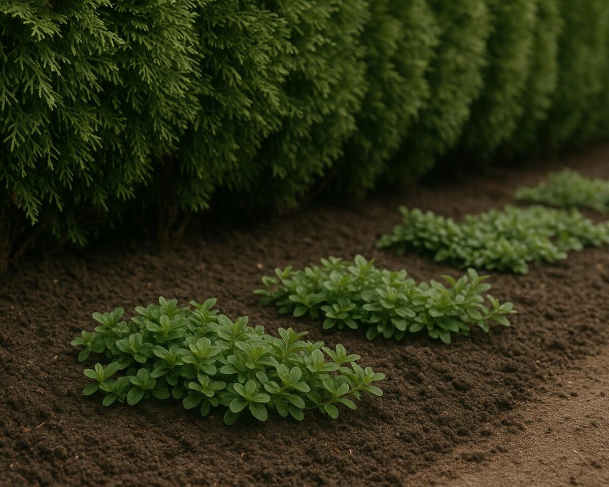 En tujahäck är en vacker och praktisk lösning för att skapa grönska och avskildhet i trädgården – men vad gör du med marken vid häckens bas?